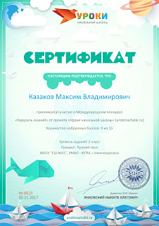 В Международном конкурсе «Карусель знаний» по русскому языку, от проекта «Уроки начальной школы», который стартовал в ноябре 2017 года, обучающиеся 2 Д класса заняли призовые места. Поздравляем победителя и участников конкурса!